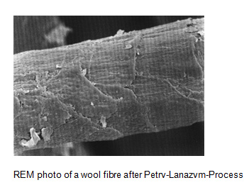 通过Petry-Lanazym-Process一步法工艺,与Chlor-Hercosett-Process相比,羊毛的鳞片部份分降。羊毛纤维获得光滑的表面结构,有助于羊毛纤维双向滑移,降低缩绒趋势。