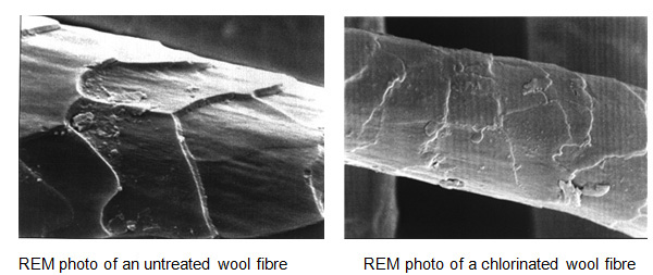 这个工艺是,第一步先用强酸性的氯,随后用亚硫酸盐处理,去除羊毛纤维表面的鳞片。第二步,采用高分子树脂。两步都使纤维表面更加平滑,纤维之间的滑移减少,缩绒的趋势大大降低。